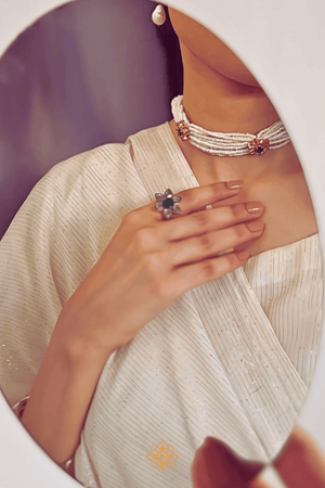 The Jahanara Choker is a breathtaking piece that embodies the essence of luxury and tradition. This particular flower was a very prominent design feature in architecture and mughal daggers. Crafted from high-quality silver, this choker features intricate designs that reflect the rich heritage of South Asian artistry. Its elegant silhouette hugs the neck beautifully, making it a perfect statement piece for both casual and formal occasions.