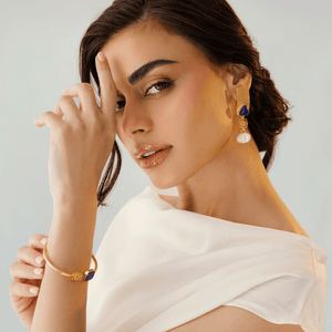 Layla is made in 925 sterling silver with hanging lapis lazuli and real mother of pearl. Each mother of pearl stone varies in color and shade as they aren't exposed to any chemicals or treatments that may alter its colors. Finished in 18k gold plated polish