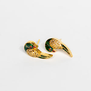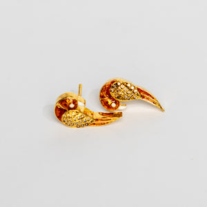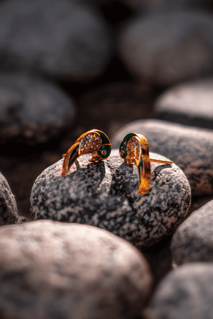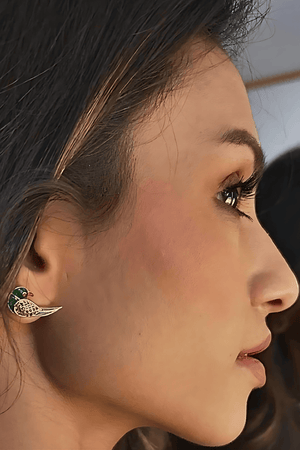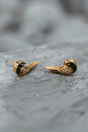 Mian Mitthu Meena Gold Plated Tops represent the rich cultural history of Indo-Persian storytelling and eloquence, with parrots being a prominent symbol. These birds were highly valued in Mughal harems as informants, and were even revered as guards in some cases. This showcases the royal's appreciation for the arts and their incorporation of nature in their daily lives, as seen in their art, jewelry, and architecture. Jehangir, known for his love for art, was particularly renowned for this tradition.Mian Mitthu, is crafted in 925 sterling silver with champagne stones and finished with green and red meenakari.