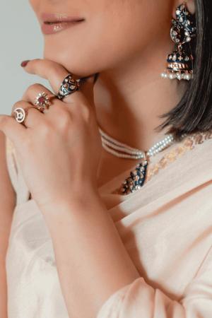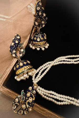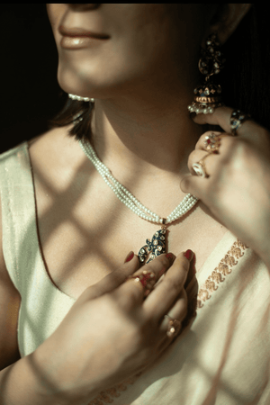 The chaharbagh also called charbagh gardens, were of persian origin but done lavishly and elaborately by the mughals. Their gardens have captivated people for centuries for their exuberance and extravagance. Peacock was also a representation of power and royalty in the mughal era. The peacock and its feather motifs were greatly found in architecture of the mughals. Infact, the throne comissioned by mughals was inspired by same and is also known as Peacock Throne. Mumtaz is crafted in 925 sterling silver, with Meenakari, kundan and real pearls.