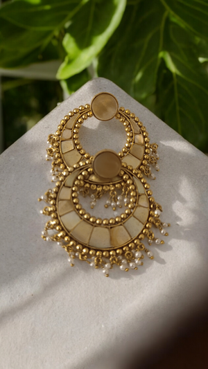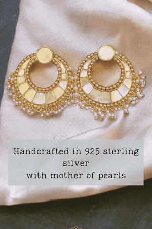 A classical take on evergreen chaand baali, its roots going back to royals and Hyderabad's nizam. It's one of the few shapes that has enchanted people for centuries. Sahiba, is crafted in 925 sterling silver and kundan embellishments with hanging pearls.