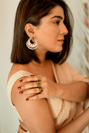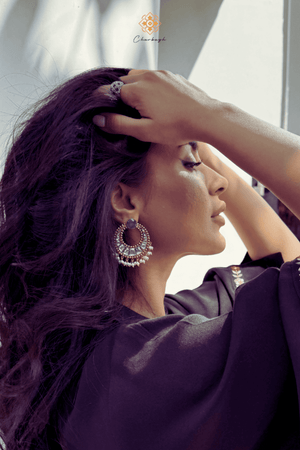 A classical take on evergreen chaand baali, its roots going back to royals and Hyderabad's nizam. It's one of the few shapes that has enchanted people for centuries. Sahiba, is crafted in 925 sterling silver and kundan embellishments with hanging pearls.